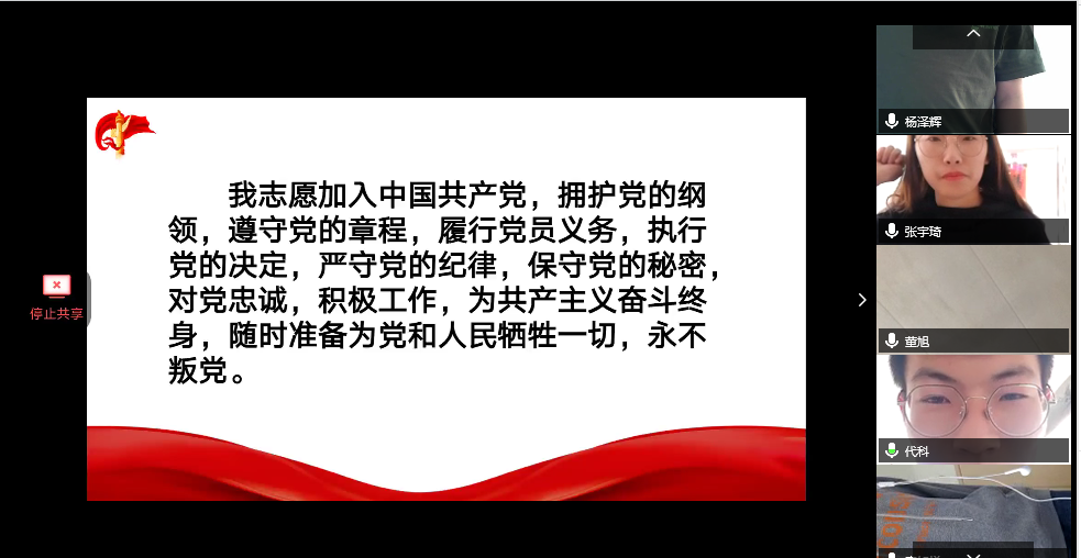 北京大学援鄂医疗队的“90”后党员用实际行动体现了作为党员的忠诚与担当,他们把所学所知挥洒在祖国和人民最需要的地方,为了国家与人民,冲锋在前,不惧艰险,也终于不负使命,不负重托,让青春在党和人民最需要的地方绽放绚丽之花。他们的精神使与会党员深受感染和鼓舞,于是支部党员同志们饱含热情的用书法重温入党誓词,并在屏幕前相互展示了自己的作品,最后全体与会党员起立,高举右拳,进行了庄严的宣誓。