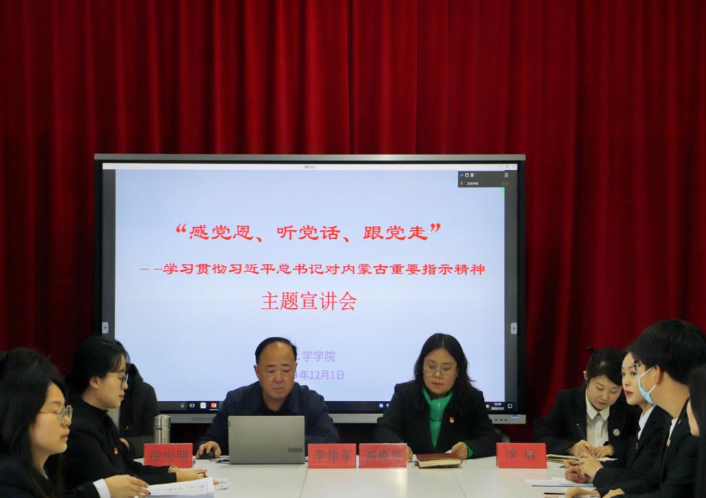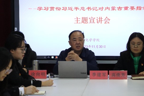 为持续深入学习贯彻习近平总书记对内蒙古的重要指示精神,教育引导化学学院青年学生树立共产主义远大理想,坚定中国特色社会主义共同理想,坚定感党恩、听党话、跟党走的政治信念,2023年12月1日,化学学院党总支书记李建军以“感党恩、听党话、跟党走”主题为学生会及各班级的学生骨干开展了主题宣讲会,会议要求参会学生认真学习理解,并以班级为单位分别组织开展宣讲。