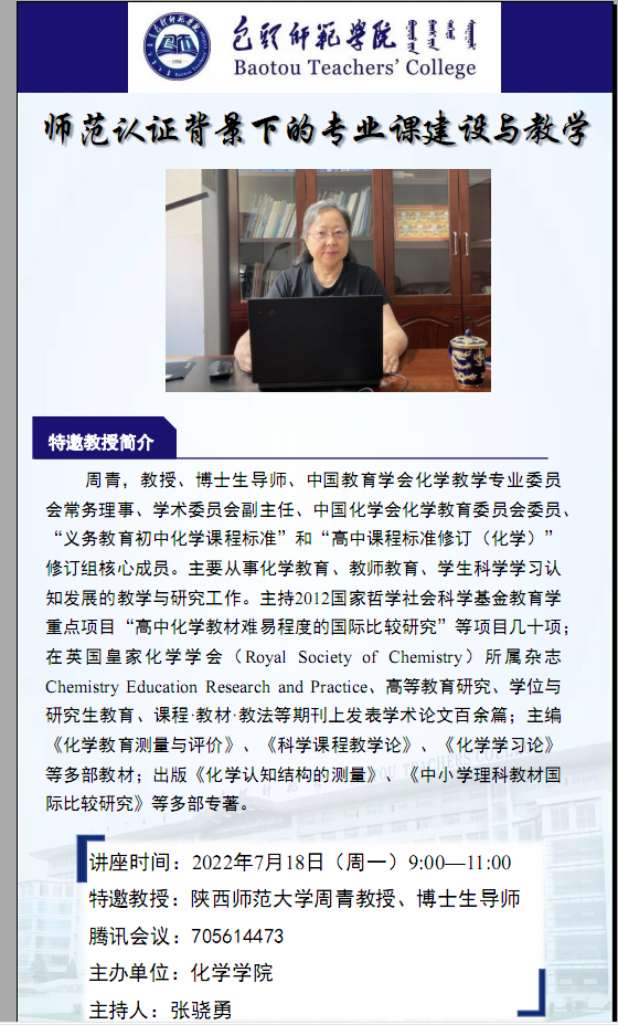为推进化学学院教师教育高质量发展,加强教师教育队伍建设和教育教学能力提升,2022年七月18号上午九点到十一点半,陕西师范大学周青教授为我院教师带来了一场“一线教学教师如何进行培根铸魂”的精彩讲座,周青教授从三个方面(如何认识师范专业专业认证、师范专业认证背景下的化学专业课教学、探索发展学生专业志向与能力的专业化教学)进行了详细的讲解,并强调高校教师要培养学生专业志向和专业能力,培养化学专业的代言人。