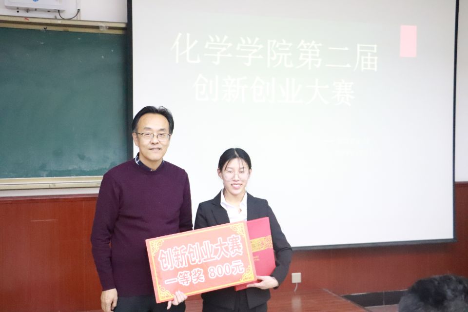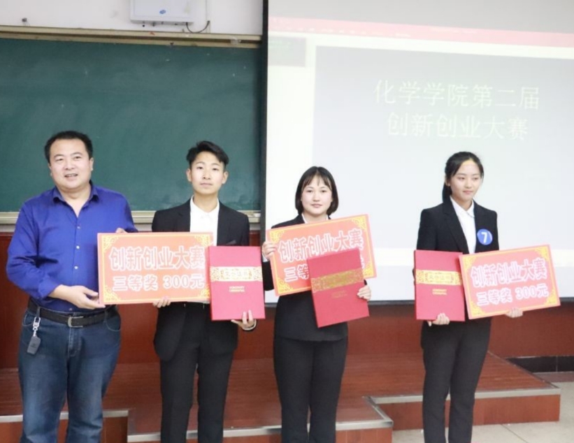 为贯彻落实全国教育大会精神,加快实施创新驱动发展战略,适应和引领经济发展新常态,推进“大众创业,万众创新”。同时为了拓展化学学院学生的知识面,提高同学们的创业、择业、就业能力,化学学院于2019年12月11日在博学楼600举办了“化学学院第二届‘创易人生’创新创业大赛”。化学学院党总支书记史继敏老师、副书记冯丽老师、办公室主任郭玉玮老师、学工办辅导员张旭老师、学生会副主席蒲瑞龙担任了本次大赛的评委。