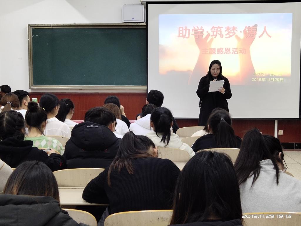 为落实教育部“进一步加强学生资助工作”要求,大力宣传国家资助政策及成效,激励广大受助学生奋发自强、立志成才、感恩奉献,我院于2019年11月29日晚19:00在博学楼400举办了以“助学·筑梦·铸人”为主题的感恩教育活动。学工办辅导员魏婷和学生会副主席魏智博、刘亚龙、姜明双参加了此次活动。