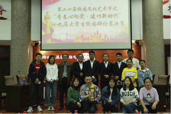 在2019年5月9日晚,第二十届校园文化艺术节“青春心向党,建功新时代”校园辩论赛决赛,在学术报告厅举行。化学学院与文学院进行冠亚之争。