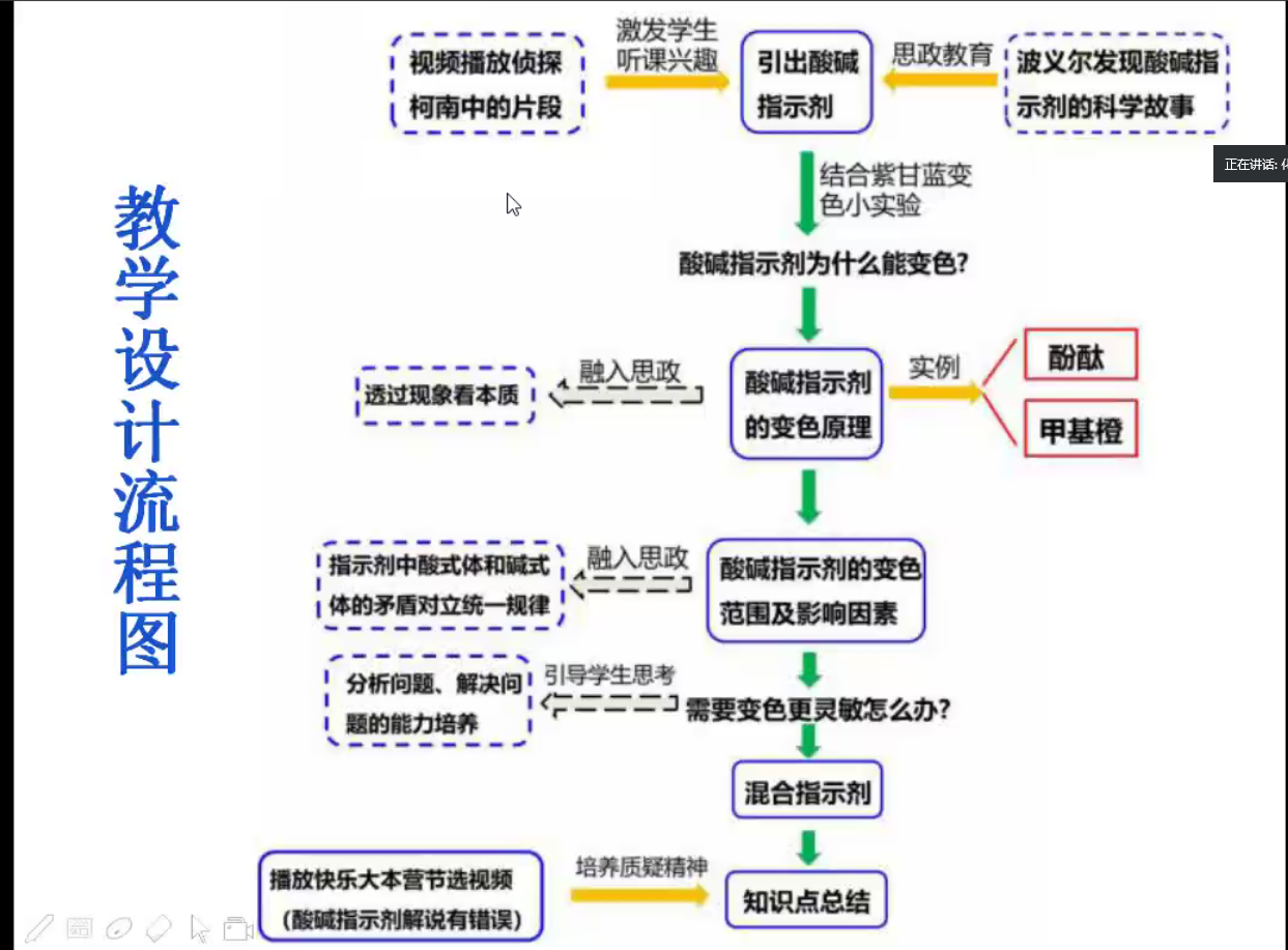 刘文芳博士就《分析化学》课程中酸碱滴定法这一章节为例,运用讲授法、启发法和案例法相结合的方式对酸碱指示剂操作进行讲解,从课前导入、发现问题和解决问题出发,将理论知识学习和思政教育有机融合。