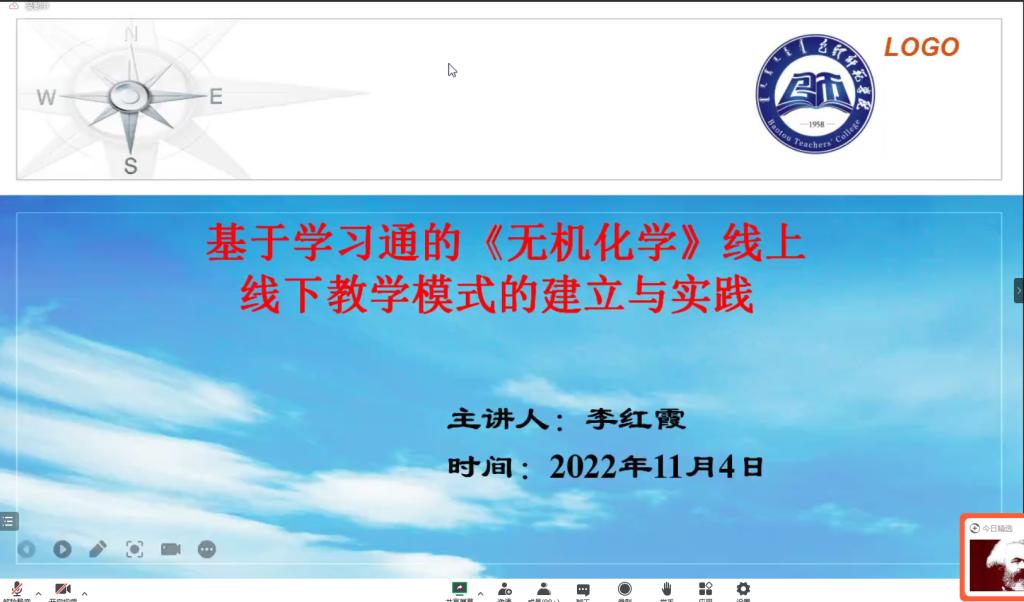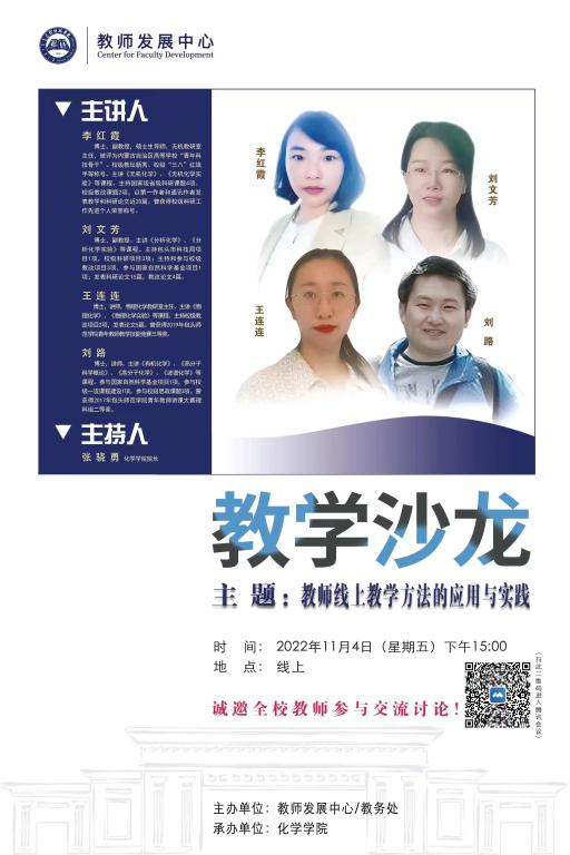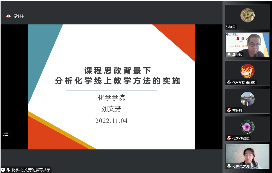 为进一步提升教师线上教学质量,推进线上线下混合课程改革,11月4日,由教师发展中心与教务处主办,化学学院承办的“教师线上教学方法的应用与实践”主题教学沙龙活动通过线上顺利进行。活动邀请了我院李红霞(博士)、刘文芳(博士)、王连连(博士)和刘路(在读博士)四位教师进行了线上教学课程改革经验分享。教师发展中心主任袁秀利老师,化学学院领导班子成员、全体教师及相关学院部门教师及化学学院师范生近140余人通过腾讯会议参与次教学沙龙活动。活动由学院张骁勇副院长、化学系系主任马学林博士联合主持。