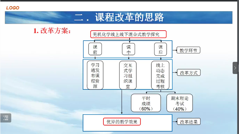 李红霞博士以《无机化学》这门课程为例,依托在线学习平台将混合式教学改革与传统教学方法进行对比,突出了线上线下结合教学的优势,过程中,李老师从混合式教学的改革方案和实施过程等多维度上进行细致讲解,并以2022级化本班级作为个案分析,从课前准备、课中互动、课后作业线上上传、教学反馈等方面进行分享。