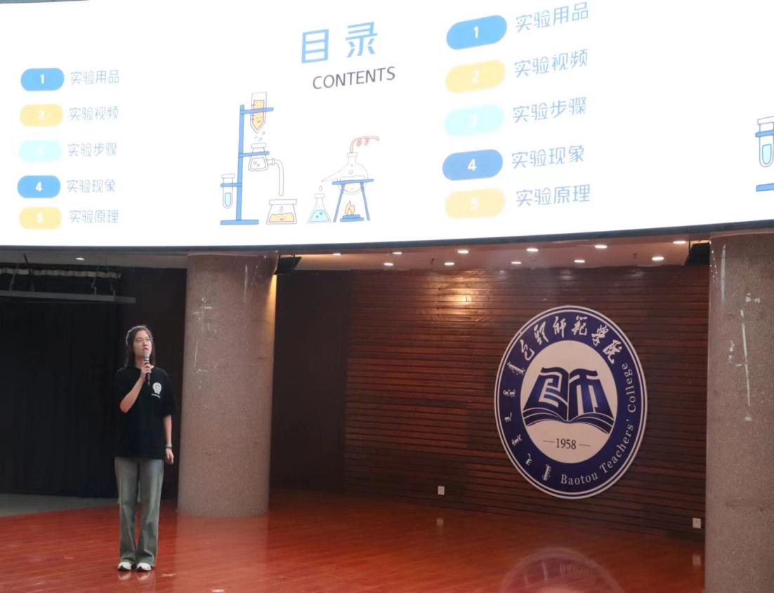 担任此次大赛的评委分别为化学学院王沙老师、武凤霞老师、校学生会执行主席范玉晖、历史文化学院执行主席赵烨鑫、物理科学与技术学院执行主席张浩。本次实验技能大赛决赛非专业组的参赛选手来自不同学院,通过初赛的选拔共有12支参赛队伍晋级决赛。决赛现场气氛热烈,选手们紧张而充满激情的展示着自己的化学知识。本次比赛分为两个环节。第一环节,选手比拼:参赛选手进行实验视频展示及相关PPT讲解;第二环节,观众互动:主持人提问相关化学知识观众进行抢答,抢答成功的同学可获得精美小礼品一份。