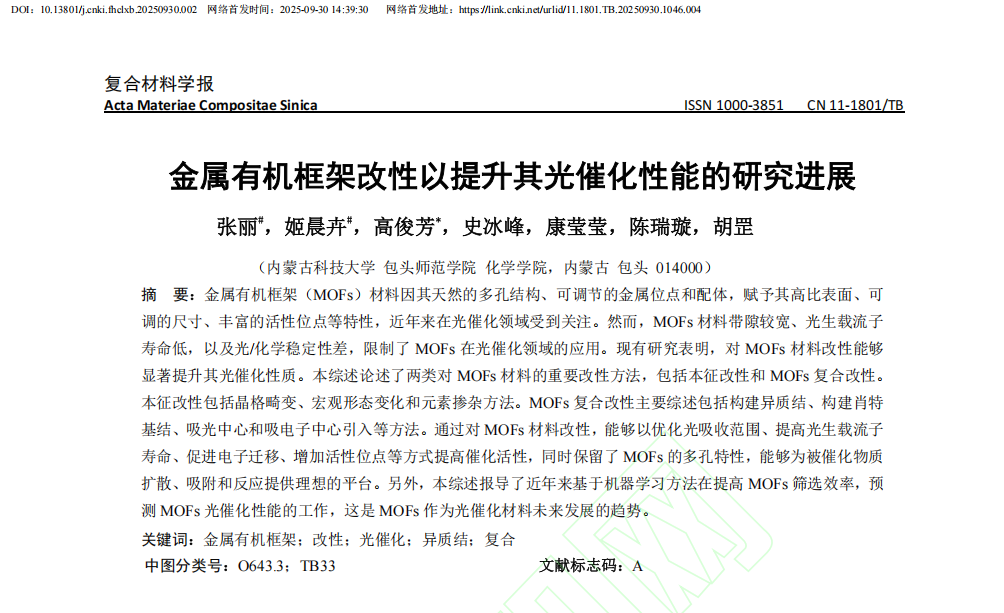 开云官方端网站登录入口为第一署名单位,“包头稀土氟材料重点实验室”团队师生在中文领军期刊《复合材料学报》(中国科技期刊卓越行动计划--中文领军期刊,2024年度影响因子2.702)在线发表题目为“金属有机框架改性以提升其光催化性能的研究进展”的综述论文,我院2022级材料物理与化学研究生张丽和我院教师姬晨卉为共同第一作者,高俊芳教授为通讯作者。