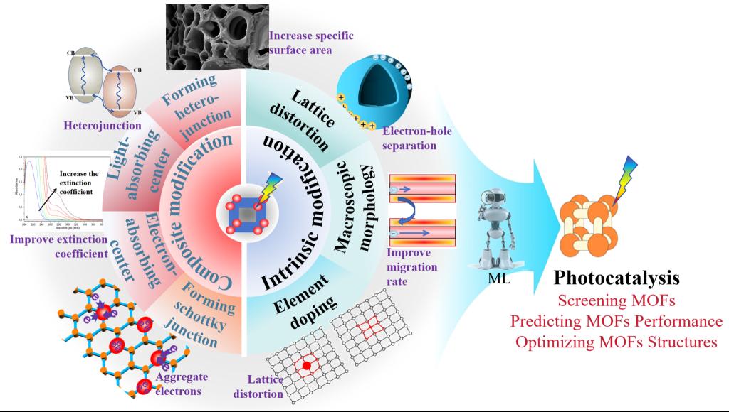 本综述论述了两类对MOFs材料的重要改性方法,包括本征改性和MOFs复合改性,本征改性包括晶格畸变、宏观形态变化和元素掺杂方法,MOFs复合改性主要综述包括构建异质结、构建肖特基结、吸光中心和吸电子中心引入等方法。通过对MOFs材料改性,能够以优化光吸收范围、提高光生载流子寿命、促进电子迁移、增加活性位点等方式提高催化活性,同时保留了MOFs的多孔特性,能够为被催化物质扩散、吸附和反应提供理想的平台。本综述报导了近年来基于机器学习方法在提高MOFs筛选效率,预测MOFs光催化性能的工作,MOFs作为光催化材料将是未来发展的趋势。