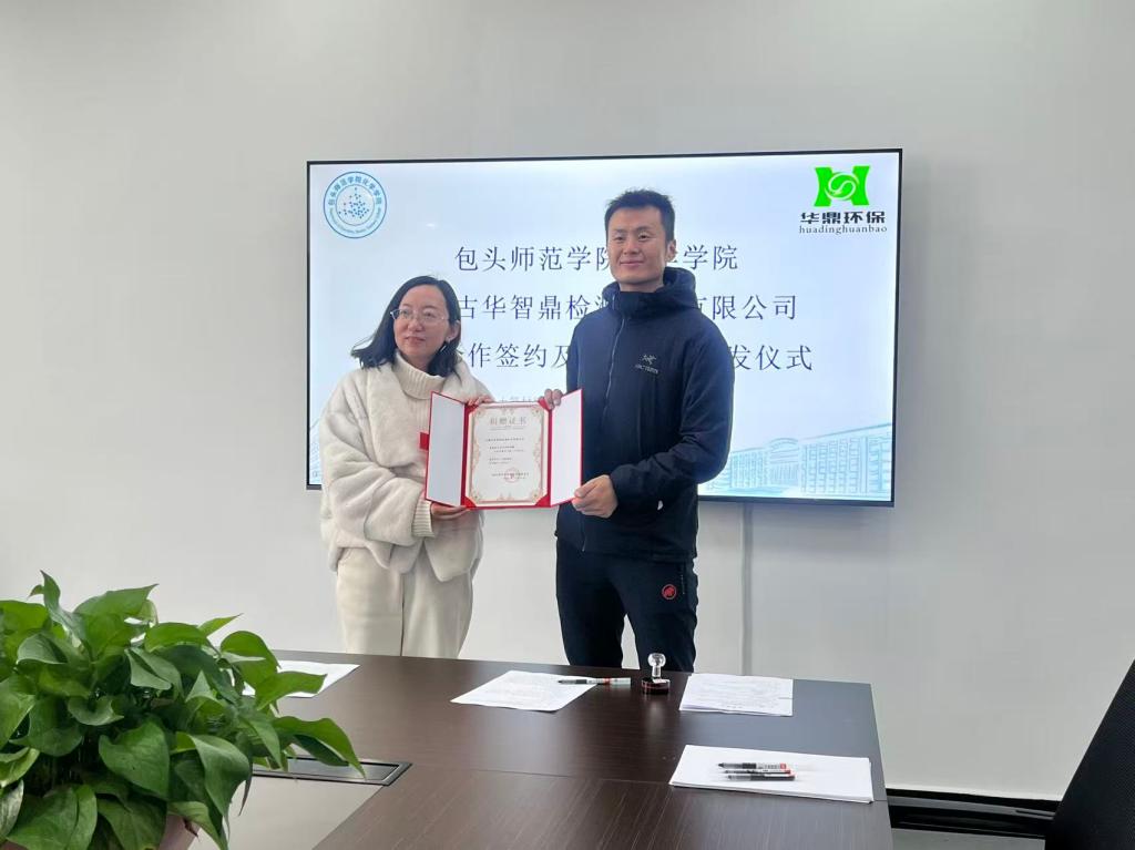 签约仪式上,开云官方端网站登录入口化学学院副院长马学林教授为企业授牌,副院长孙鹤教授为企业颁发了捐赠证书,以感谢内蒙古华智鼎检测技术有限公司对学校教育基金、对学院科研平台和才培养工作的支持