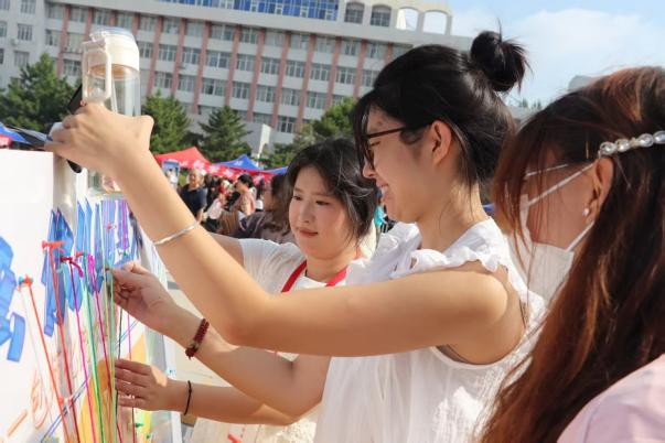 “同学,你从哪里来”主题展板,以中国地图为底,彩色丝线为桥,使新生们找到自己的家乡省份,一端系于家乡,一端系于校园,呈现出化院学子五湖四海共聚校园的一副温暖图景。
