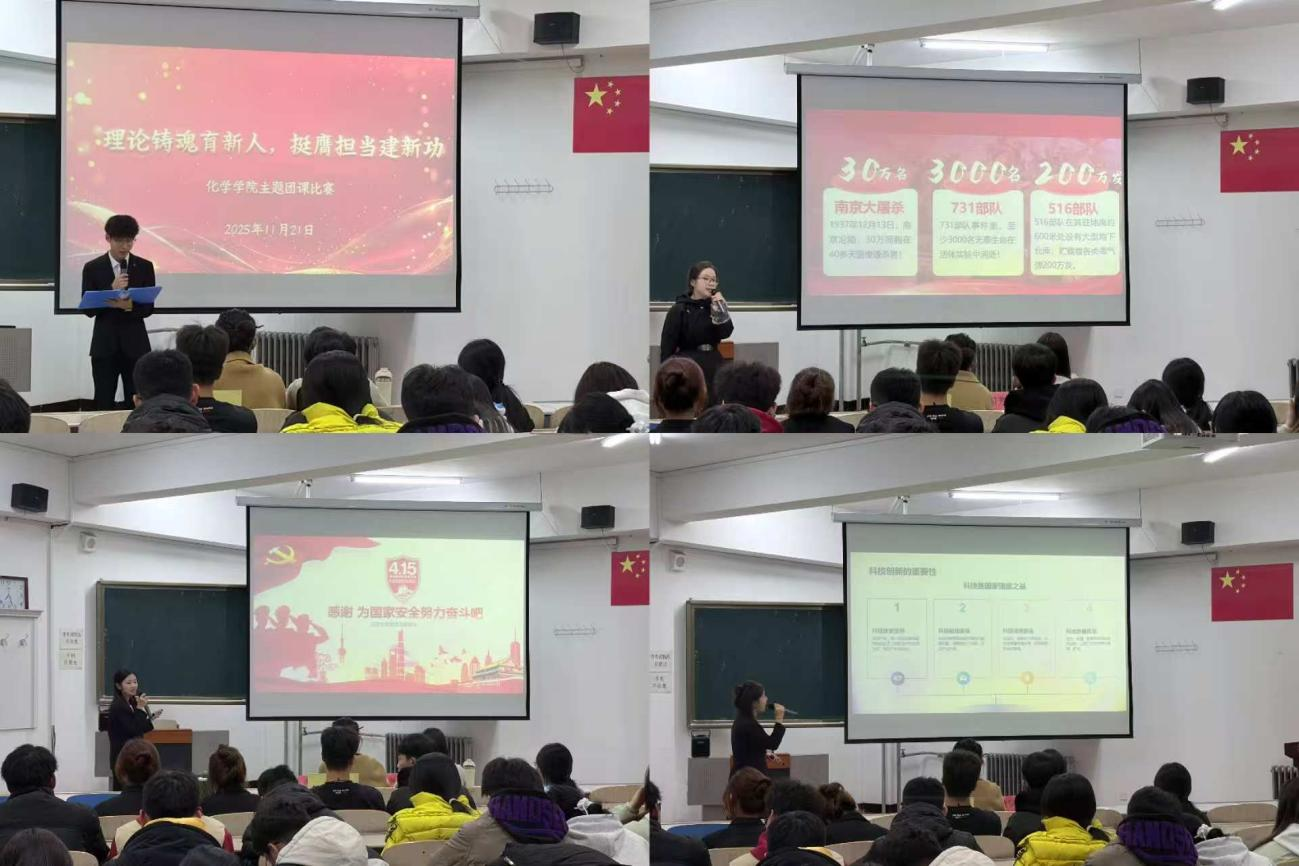 为深入学习贯彻习近平新时代中国特色社会主义思想,激励同学们坚定理想信念、勇担时代使命。化学学院团总支于2025年11月21日举办了“理论铸魂育新人·挺膺担当建新功”团课比赛。本次活动吸引了化学学院各年级团支部的积极参与,通过理论宣讲、主题演讲等形式,展现了化学学院同学们奋发向上的精神风貌。