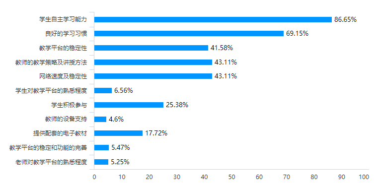座谈会前夕,学工办向全体非毕业班学生发放了疫情线上学习调查问卷,全面了解和掌握学生对线上教学的满意度等情况,并及时关注和解决困扰线上教学效果的问题,共回收有效问卷457份,超过半数学生对线上教学较为认可,愿意接受。当被问到“您认为影响线上学习效果最主要的因素有哪些?”,回答“学生自主学习能力”占比达86.65%。