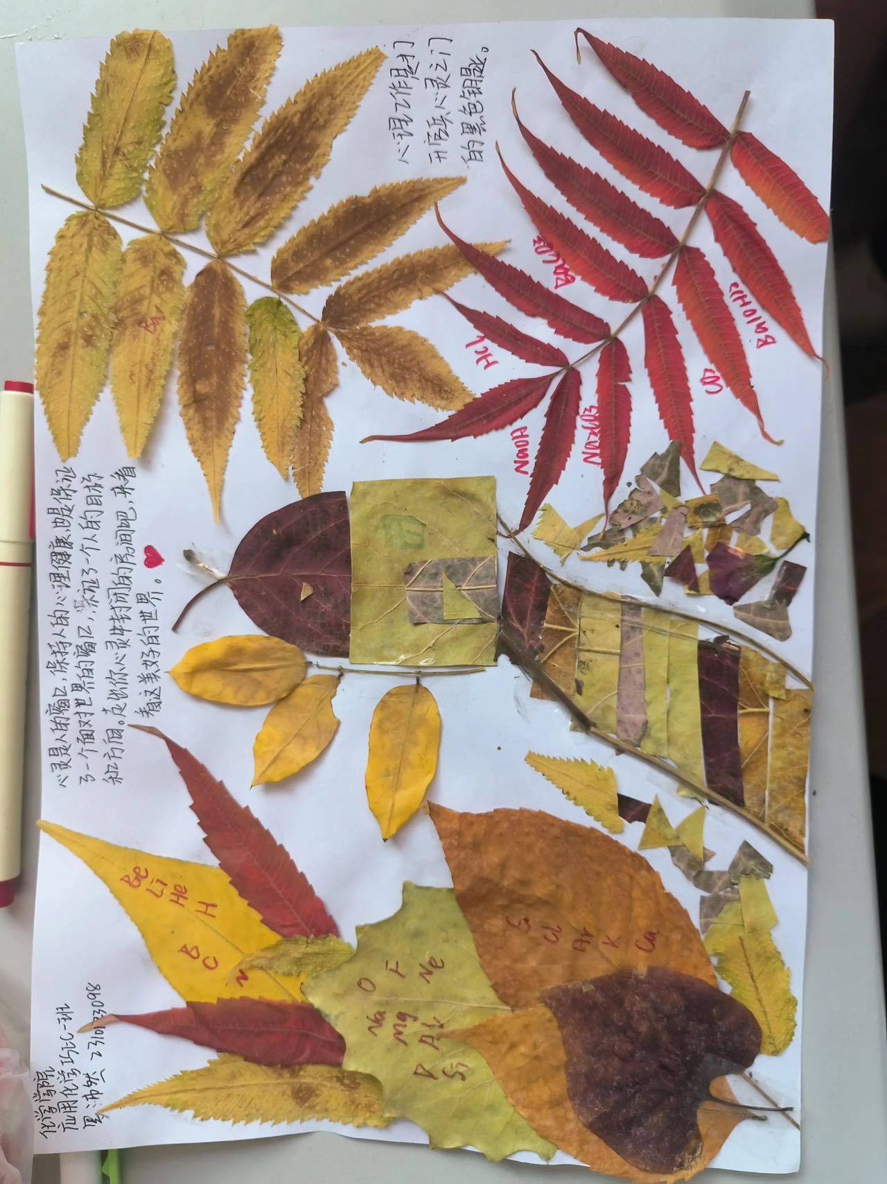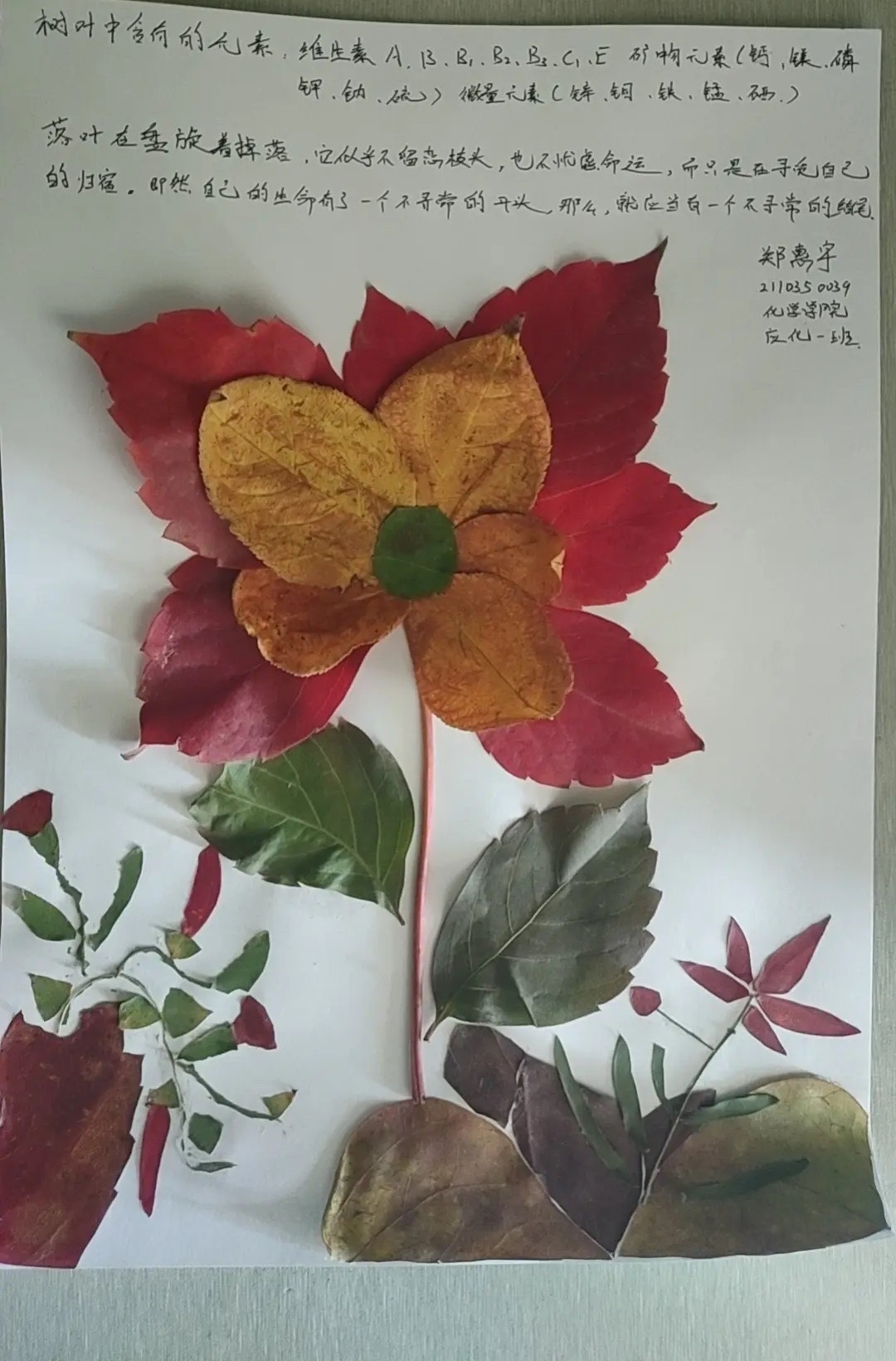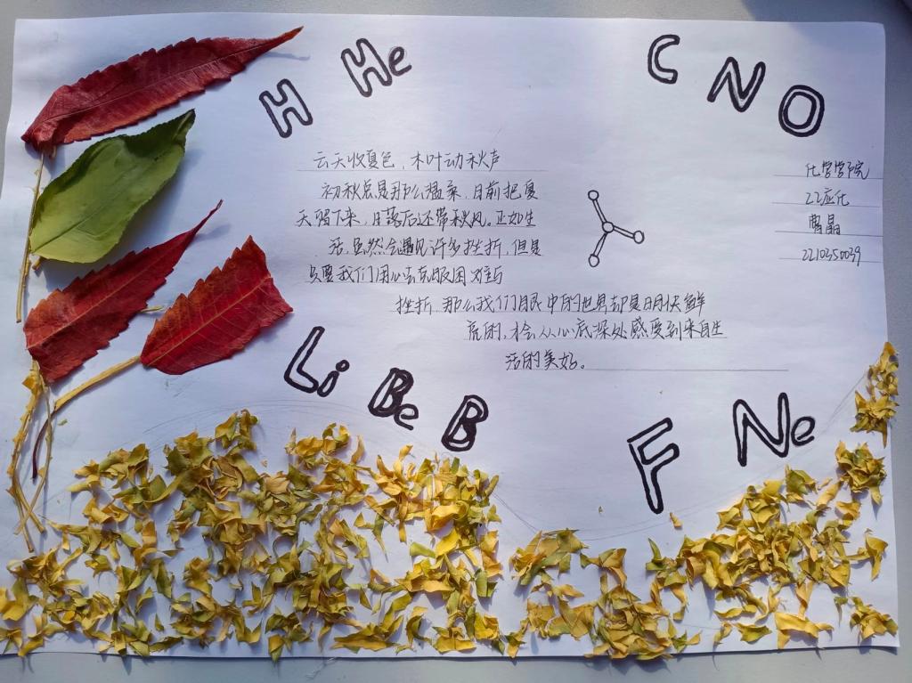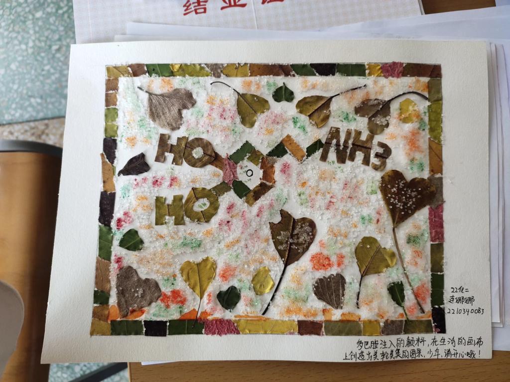 活动期间,同学们认真寻找了各种秋叶,如红色的枫叶、金黄的银杏叶、深绿的柳叶等。他们运用剪刀将秋叶巧妙地剪裁成各种形状,然后粘贴在画纸上。在充分发挥想象力的基础上,学生们将这些秋叶粘贴成与化学、心理相关的图画,创作出了一幅幅精美的剪贴画作品。同时,他们还为每幅作品配以相关的简介,以描述其心理状态。