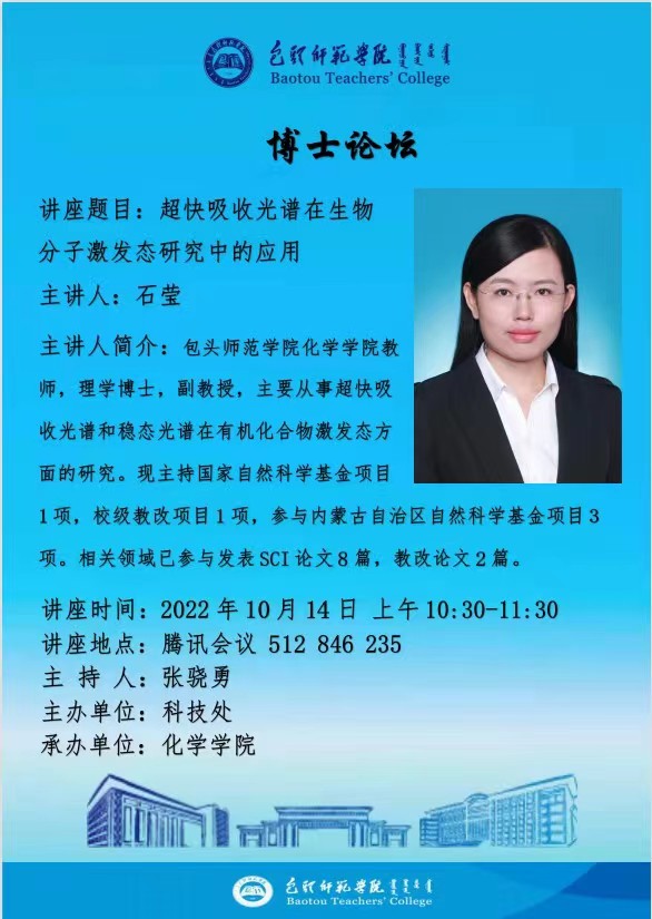 由科技处主办、化学学院承办博士论坛马上开讲,主讲嘉宾化学学院石莹博士,石莹博士毕业于中国人民大学,主要研究方向是超快吸收光谱在生物分子激发态的应用,欢迎教师、同学们参加。