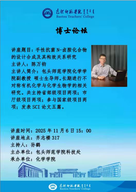 化学学院主办博士论坛马上开讲,主讲嘉宾化学学院陈万钧博士,陈万钧博士毕业于内蒙古大学,主要研究方向是不对称有机化学与化学生物学相关的研究工作,欢迎教师、同学们参加。