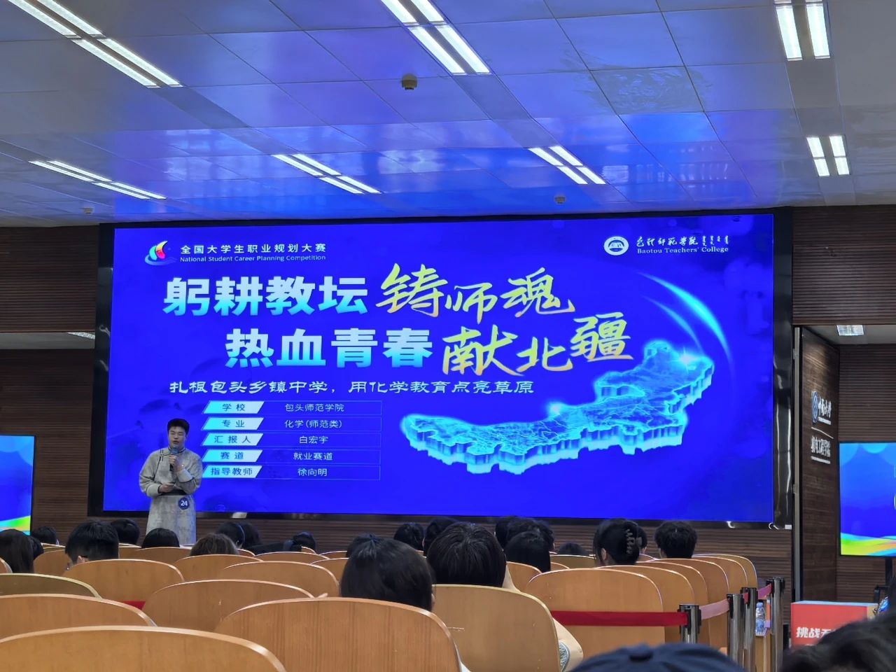 决赛中,白宏宇以《躬耕教坛铸师魂,热血青春献北疆》为题,从“职业初心—岗位胜任力—发展潜力”三个维度展开阐述。他分享了在达茂旗支教时,与孩子们在中秋篝火旁观察燃烧反应的经历,将专业知识与立德树人实践深度融合,展现了新时代青年扎根边疆、服务教育的责任担当。其出色表现以91.61分摘得金奖,成为内蒙古高教组唯一金奖得主。