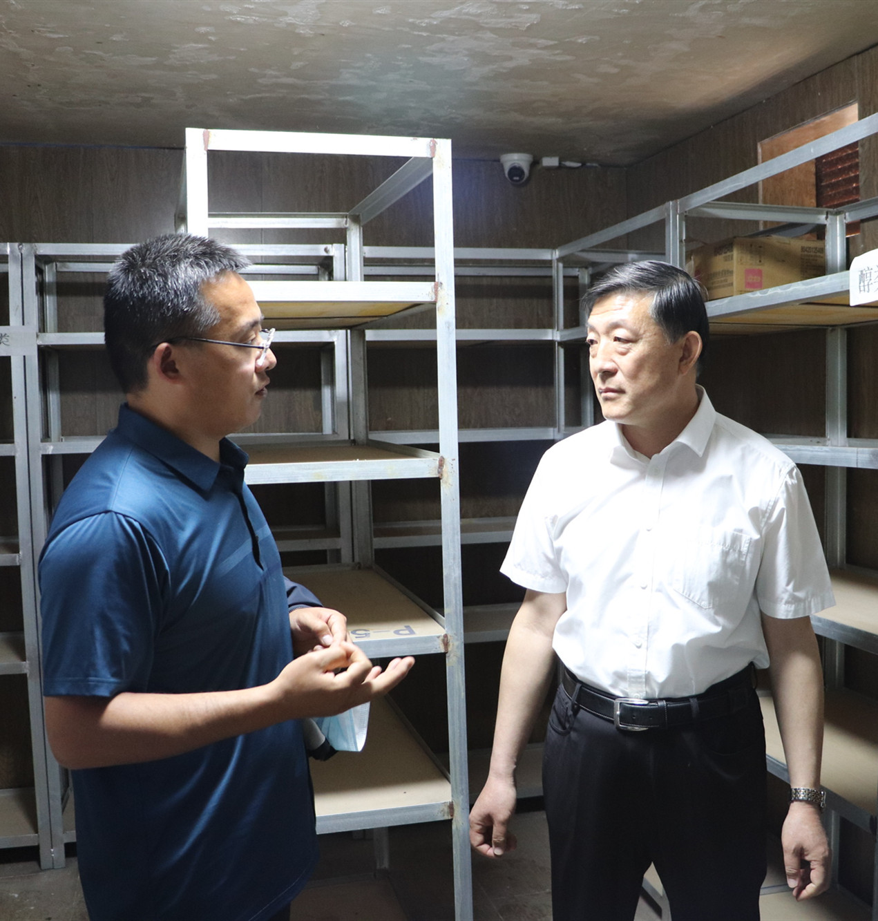 在实验楼药品库,施纪华副书记详细询问了化学药品从购置申报、入账存放管理、安全领用、实验室使用记录及废液废药回收处置等工作程序,现场核验巡查了易制毒化学品管控工作操作流程。