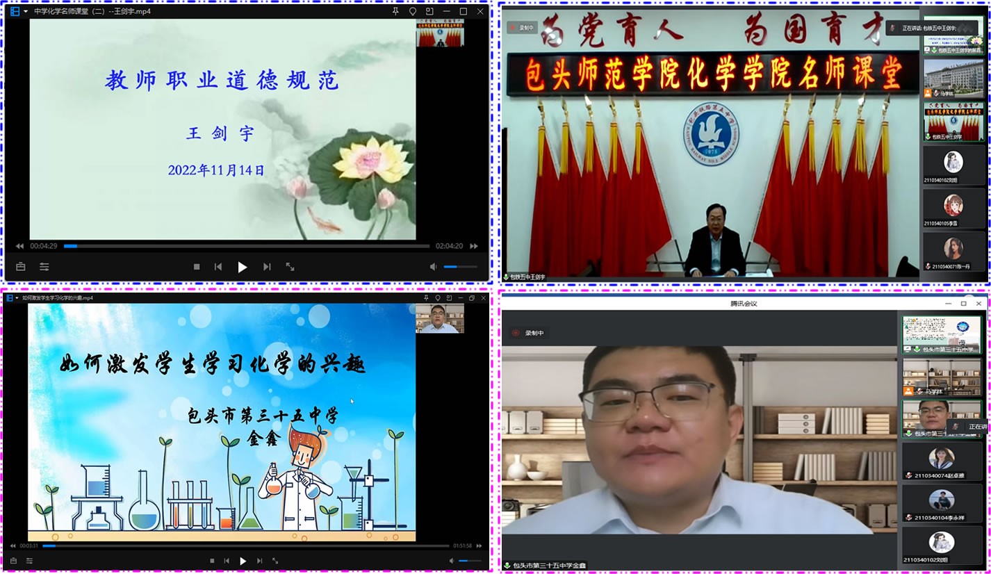 包头铁路第五中学王剑宇校长以“教师职业道德规范”为题,通过教师职业的特殊性、师德、教师职业道德的特征(融入案例)、教师职业道德的内容、教师师德的重要性、教师职业道德失范行为和提高教师职业道德规范的方法和途径等七个方面,阐述了教师职业道德规范的重要性,并提出了师范专业的大学生如何通过教师职业道德规范来提升师范专业学生的从师情怀和师德教育。