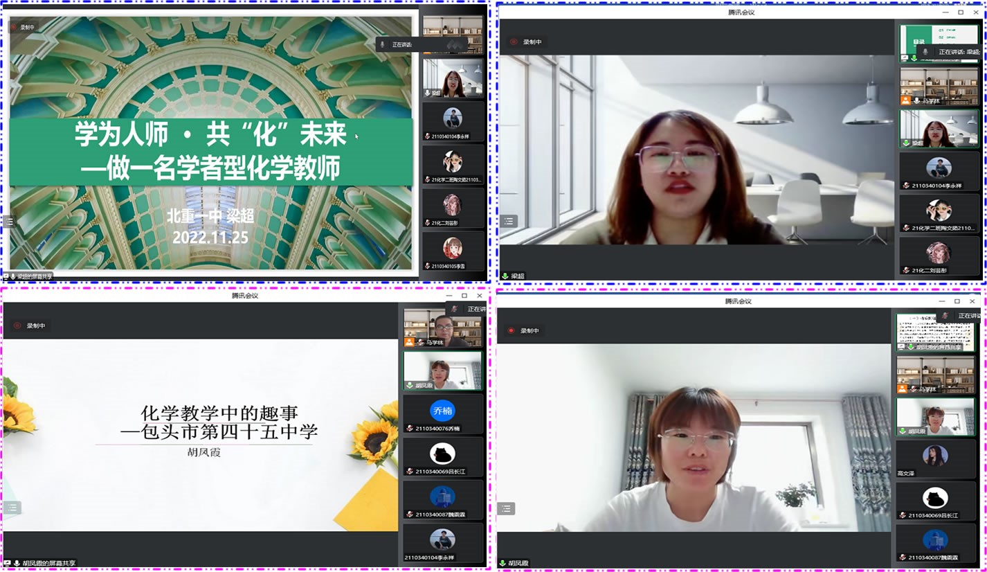 四十五中胡凤霞老师以“化学学习中的趣事”为题,通过“发生在身边的一些化学趣事”、“化学教学中可能存在的一些突发状况”和“遇到突发状况时如何处理”等三个方面,与大家分享了面试初体验、面试中体验、参与各级各类比赛中的经验与趣事和多媒体制作等,将初中化学知识,尤其是实验教学融入到实际教学活动中,以案说教,点明化学学科的特点,突出初中化学教师在教学能力的掌握、掌控与改善等方面应具备的能力与素养,并探讨了与之相关的问题思考。