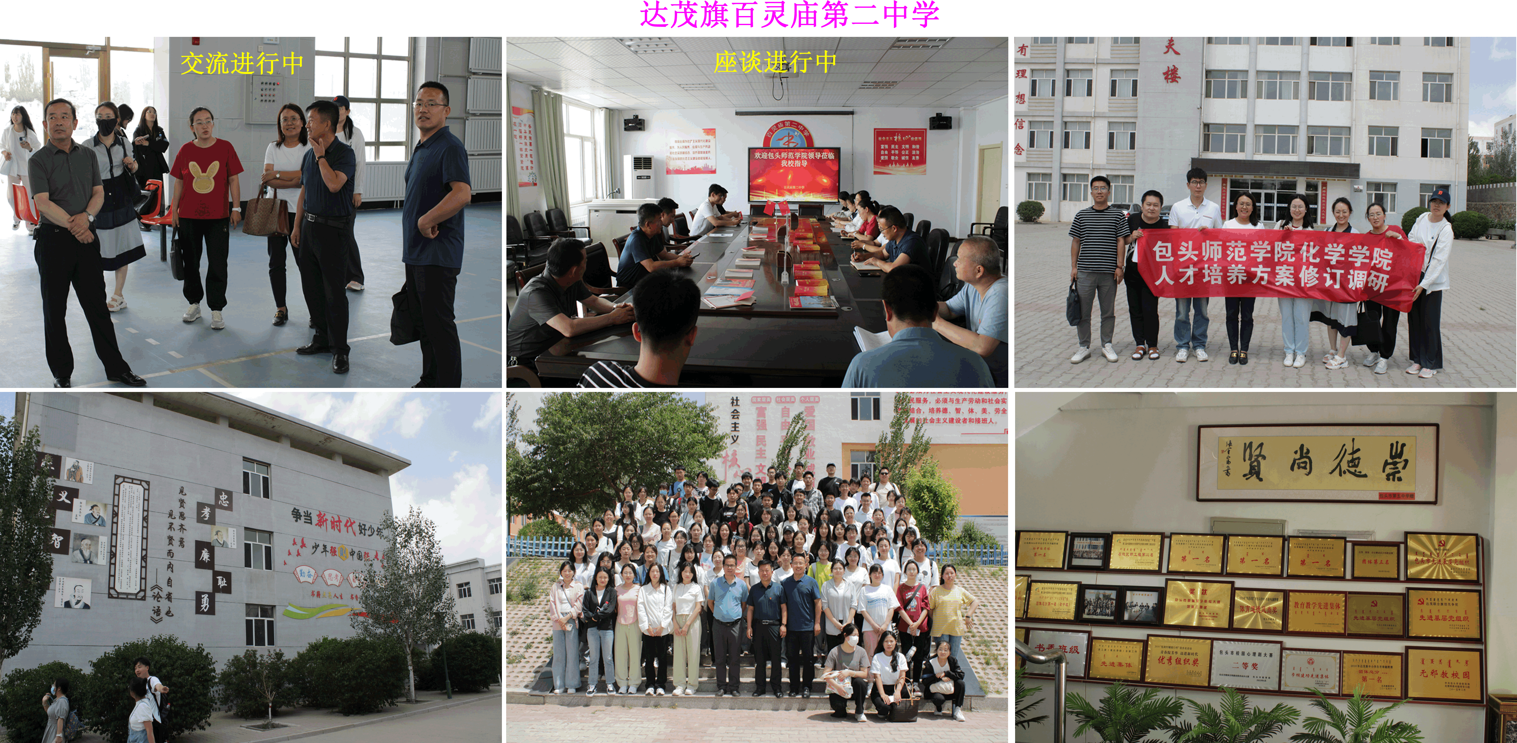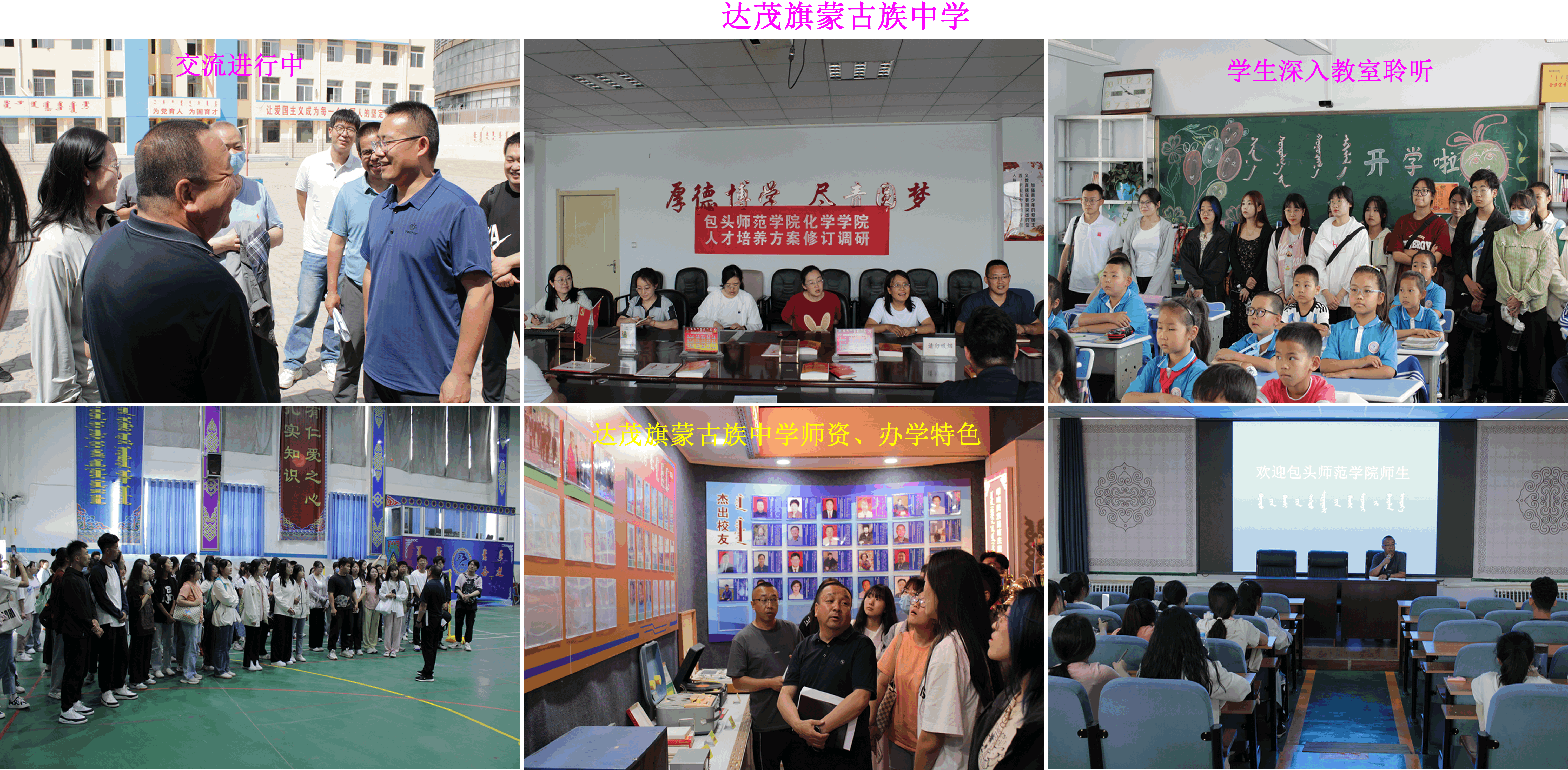 在包头市达茂旗蒙古族中学,师生观看了达茂旗蒙古族中学的升旗仪式,深入课堂感受了基层中学教师教学过程(蒙汉双语教学),参观了该校的体育馆、校史馆和其他教学场所。调研交流中,也了解到该校化学教师的学历层次相对较低,同时结合师范专业人才培养也与该校教师就师范专业教师教育课程进行了交流研讨。