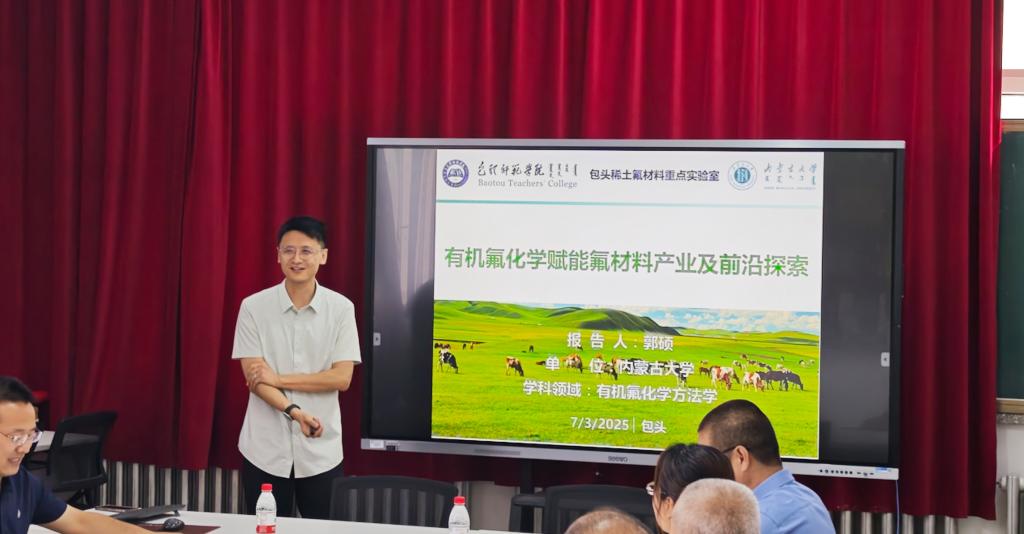 为了进一步推进包头稀土氟材料重点实验室科研方向凝练,聚势含氟材料研究,202573号,化学学院包头稀土氟材料重点实验室组织召开学术交流会,邀请内蒙古大学郭硕研究员围绕有机氟化学赋能氟材料产业前沿探索开展了专题讲座,会议由张骁勇院长主持学院教师及包头稀土氟材料重点实验室成员参会